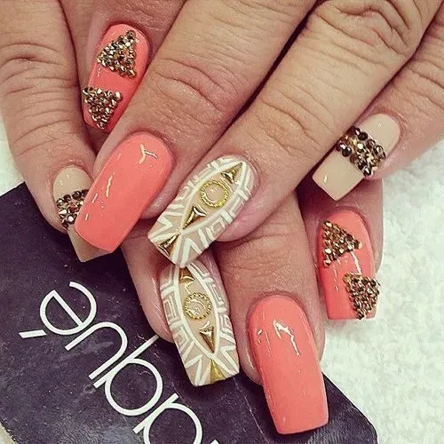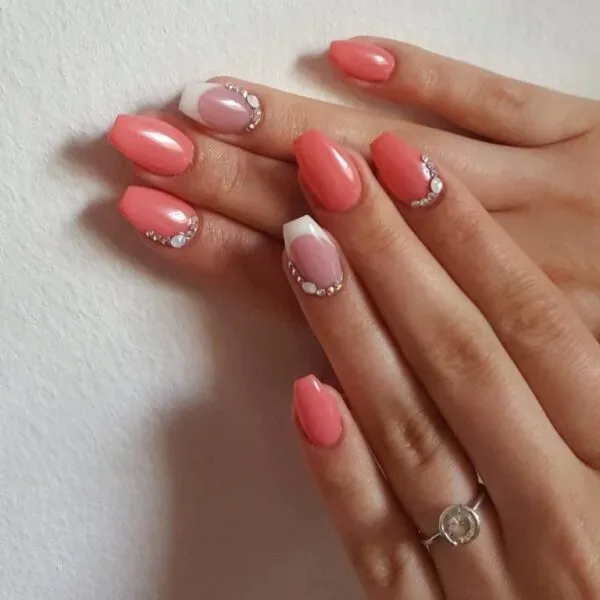 Маникюр с коралловым оттенком довольно заметен и необычен и смотрится не так агрессивно, как жёлтый, лимонный или ярко-красный. К тому же дизайн в коралловом цвете позволяет подобрать варианты как для повседневной жизни, так и для мероприятий, вечеринок и разных праздников.